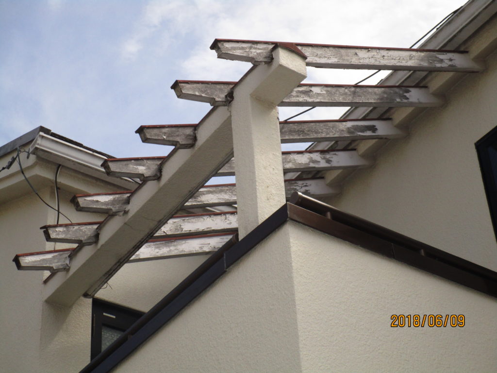 【施工内容】屋根上葺・雨樋交換・外壁塗装・ウッドデッキ防水工事