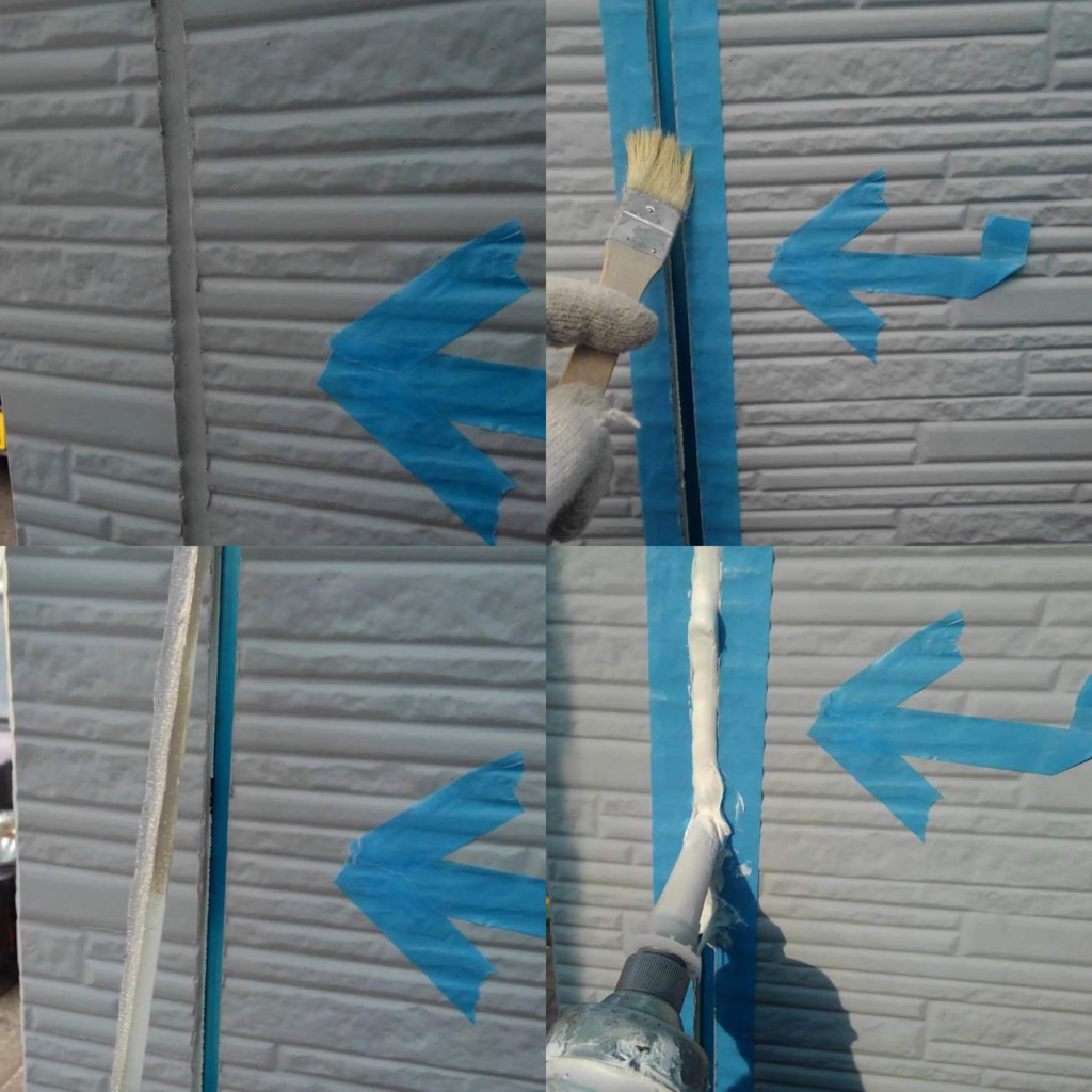外壁サイディング部コーキング打ち替え:既存コーキング→撤去→プライマー塗布→コーキング打ち