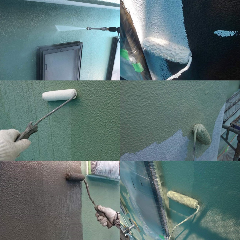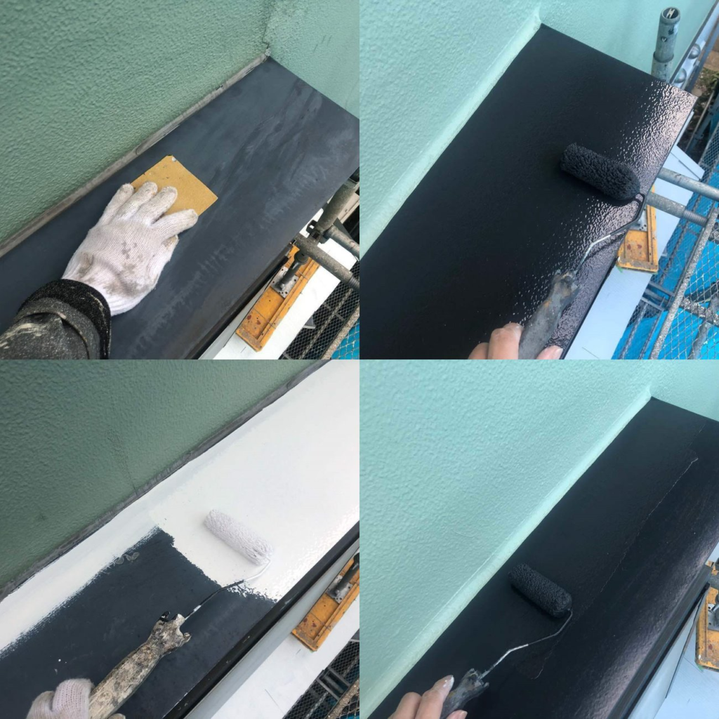外壁モルタル部防水塗装:高圧洗浄→プライマー塗布→放水下地塗布→下塗り塗布→中塗り塗布→上塗り塗布