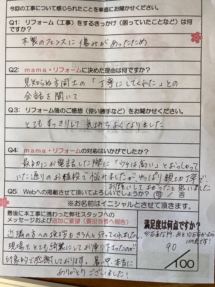 最初にお電話した際に「ウチは高い」とおっしゃっていた通りのお値段で悩みましたが、やっぱり親切丁寧で、お願いしてよかったと思いました。