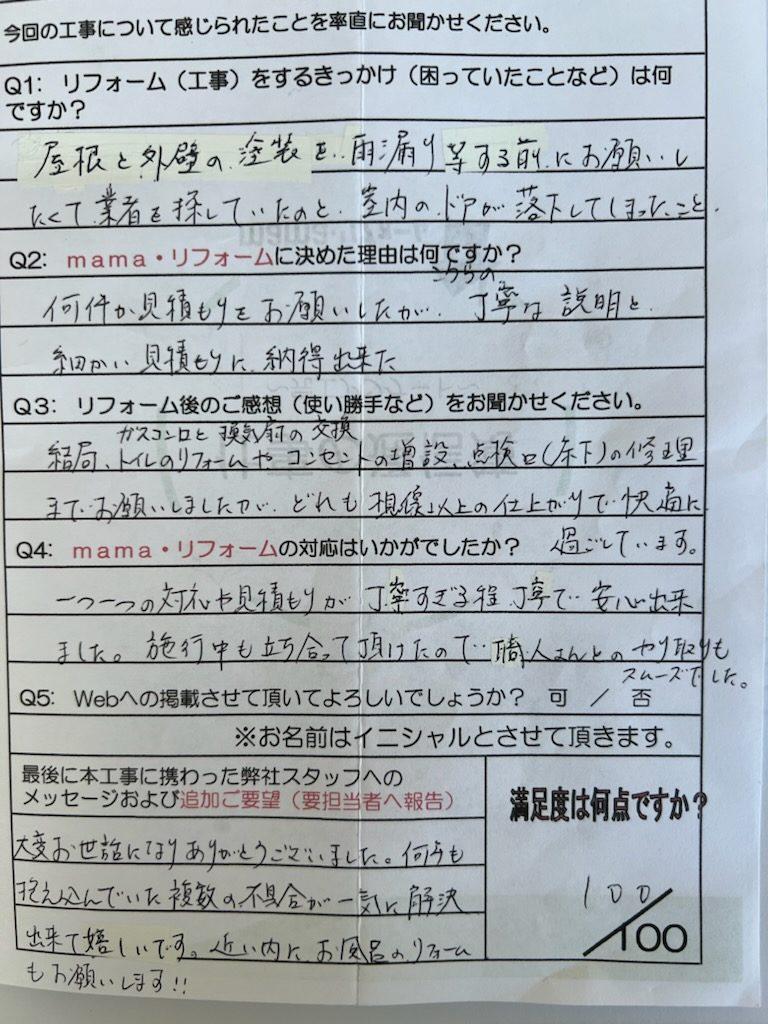 一つ一つの対応や見積りが丁寧すぎる程丁寧で安心出来ました。施工中も立ち合って頂けたので、職人さんとのやり取りもスムーズでした。
