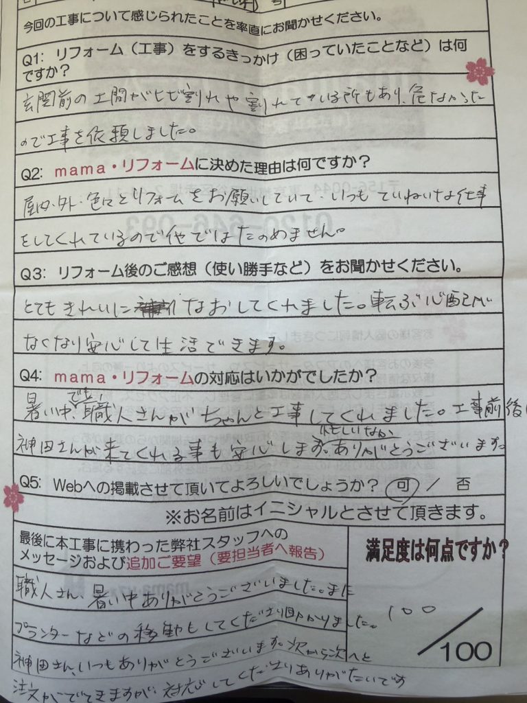 とてもきれいに直してくれました。転ぶ心配がなくなり安心して生活できます。