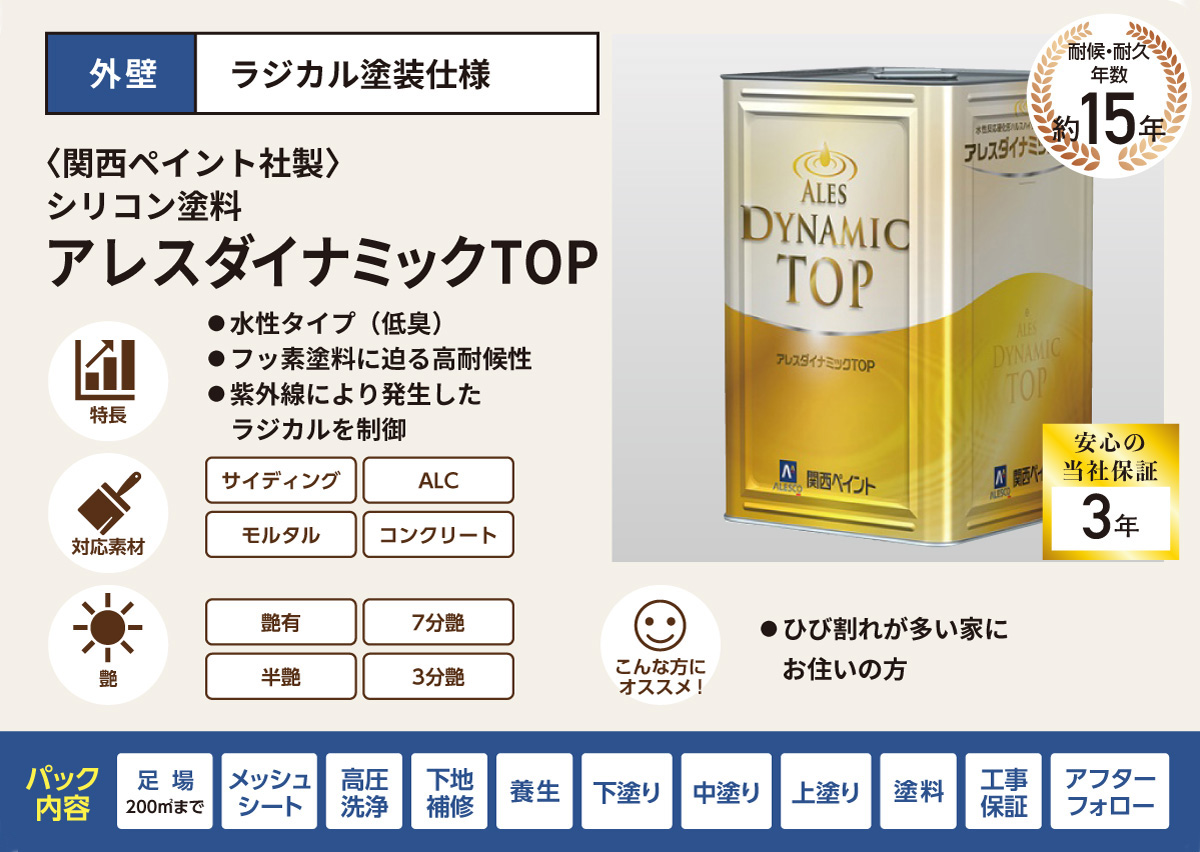 アレスダイナミックシリーズは、関西ペイントが開発した高耐候・高耐久を重視した外壁用塗料シリーズです。