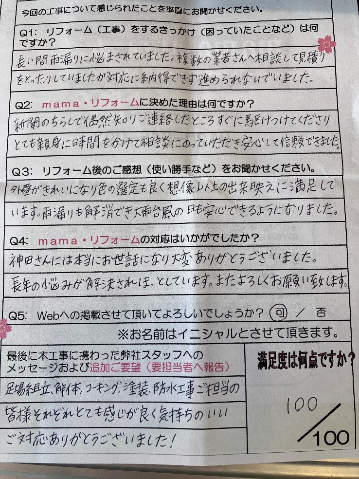 外壁が綺麗になり、色の選定もよく想像以上の出来栄えに満足しています。雨漏りも解消でき、台風の日も安心できるようになりました。
